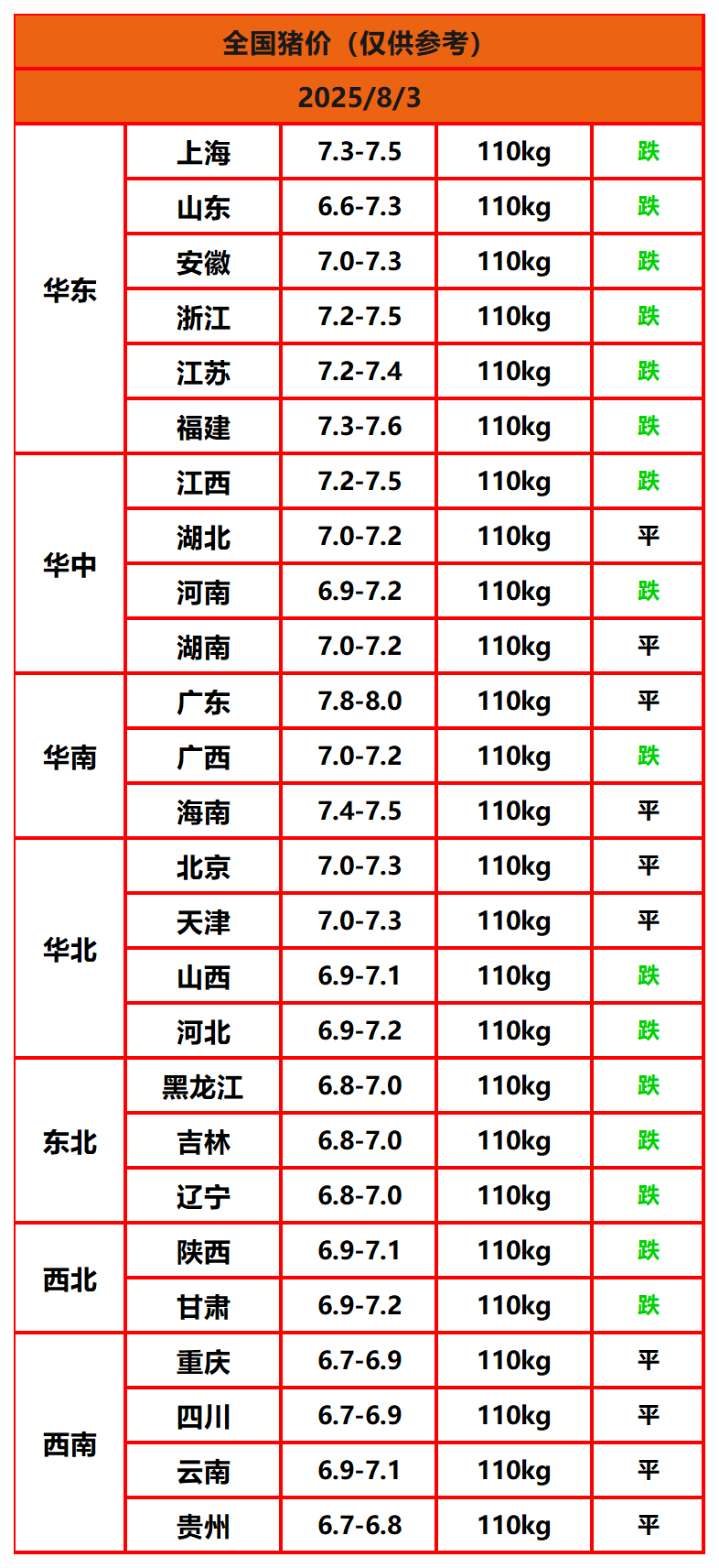 2025年8月3日猪价,今日全国猪价行情走势:0涨10平16跌。