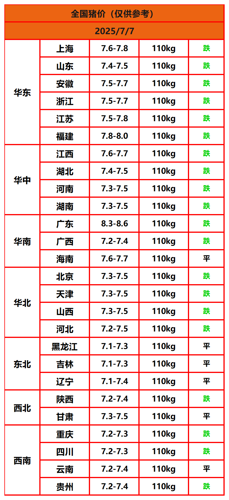 2025年7月7日猪价,今日全国猪价行情走势:0涨6平20跌。